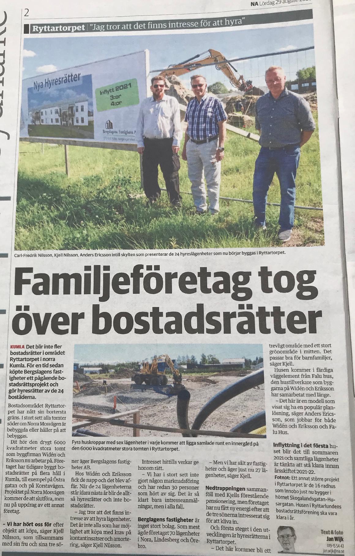 Under 2020 påbörjades byggnation av 24 lägenheter i populära villaområdet Ryttartorpet i Kumla med närhet till Kumla centrum, skola, förskola och Marieberg köpcentrum. Inflytt skedde under andra halvåret 2021.